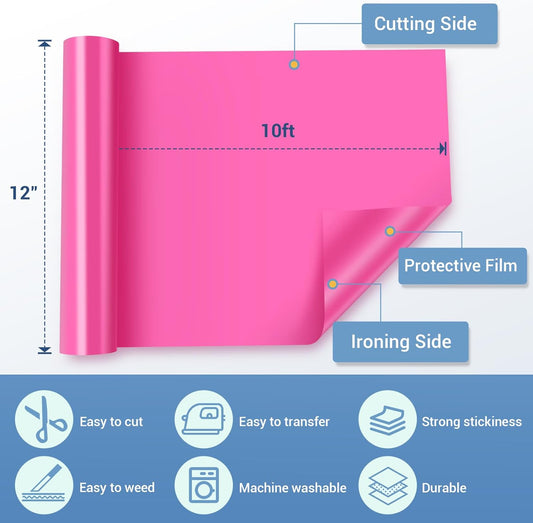 Eprcut HTV Heat Transfer Vinyl Rolls - 12" x 10ft Pink Iron on Vinyl for T Shirts, Compatible HTV with All Cutter Machines, Easy to Cut & Weed & Transfer Heat Vinyl for Craft Design,1 Roll
